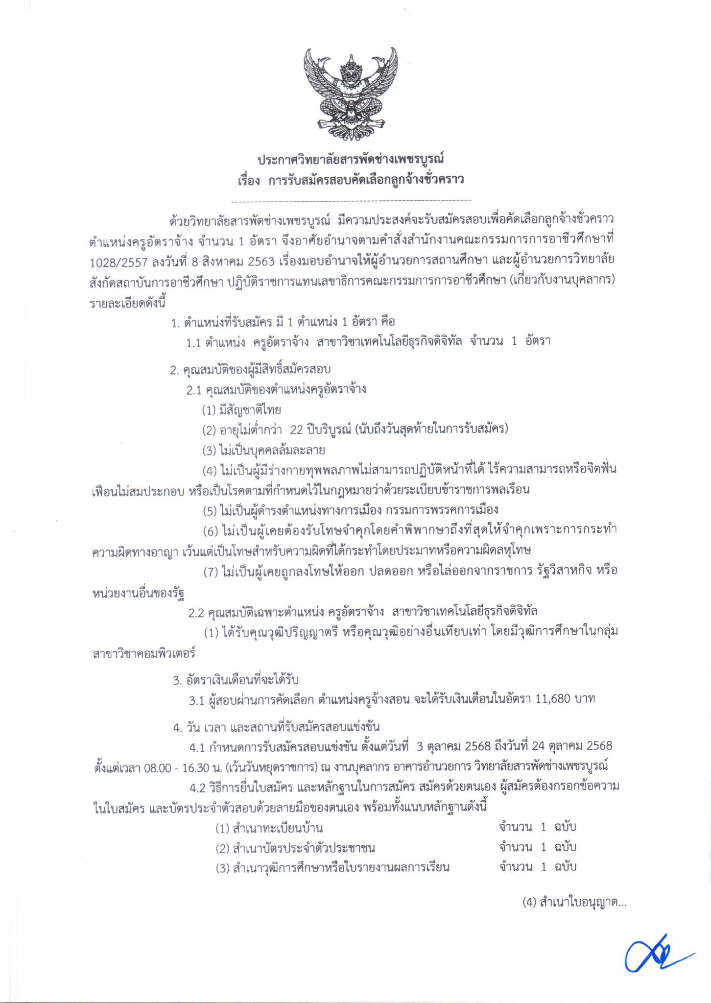 รับสมัครลูกจ้างชั่วคราว ตำแหน่งครูอัตราจ้าง สาขาวิชาเทคโนโลยีธถุรกิจดิจิทัล จำนวน 1 อัตรา