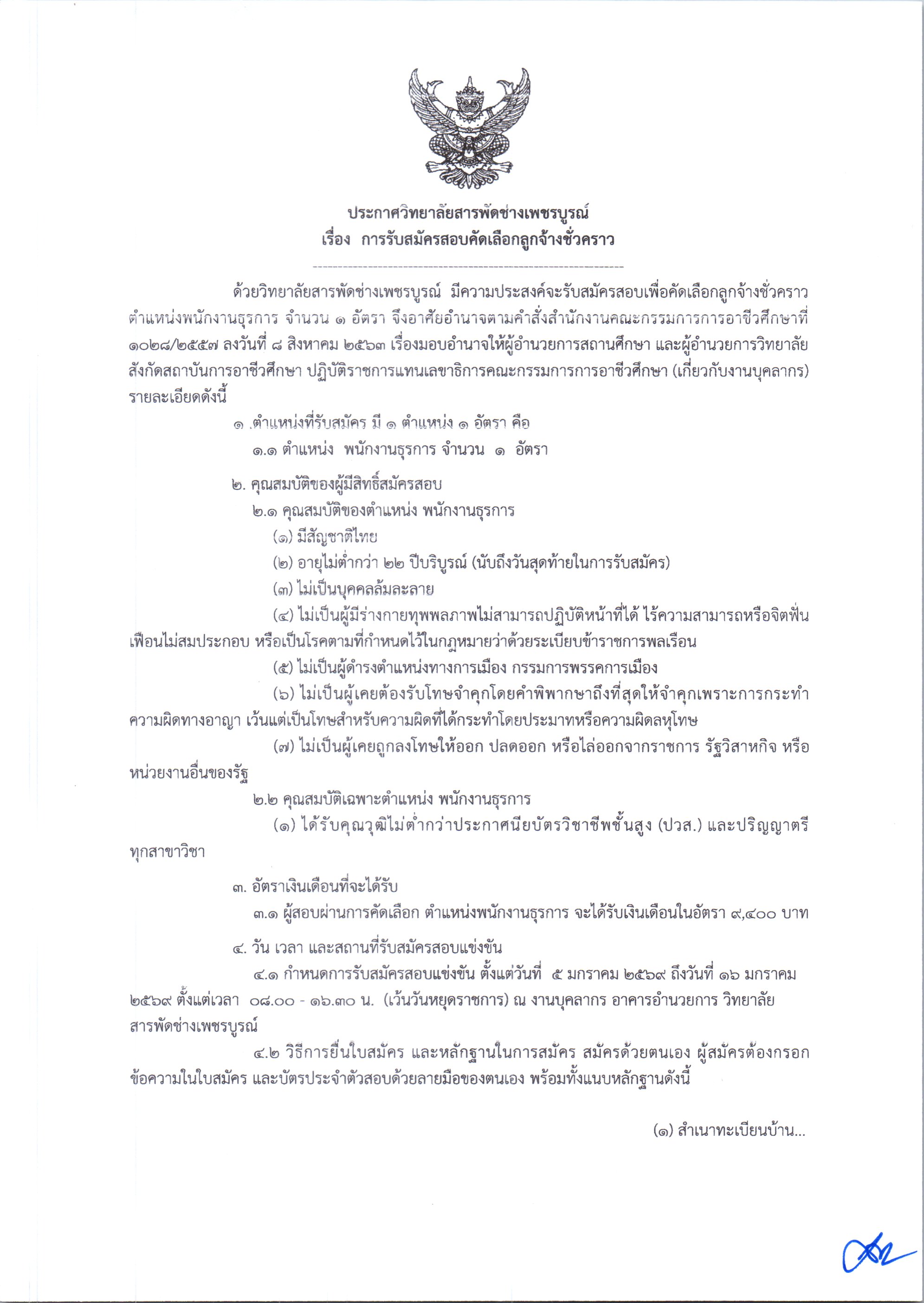 ประกาศสมัครสอบคัดเลือกลูกจ้างชั่วคราว ตำหน่งพนักงานธุรการ จำนวน 1 อัตรา